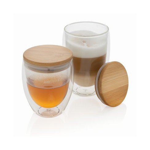 Zestaw szklanek 350 ml, 2 szt., bambusowe wieczko, podwójne ścianki, wykonane ze szkła borokrzemowego, dzięki dwuściankowej konstrukcji widać napój w środku, a zewnętrzna ścianka nie nagrzewa się, zaleca się mycie ręczne