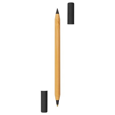 Długopis 2 w 1, "wieczny" ołówek, dzięki wykorzystaniu specjalnej wolnościerającej się końcówki długość pisania ołówka to około 1500 metrów, naostrzony, bambusowy trzon, dwie kolorowe zatyczki wykonane z papieru