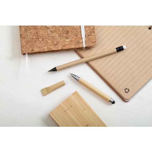 Długopis bezatramentowy z papieru z recyklingu z czarnymi elementami i gumką. Z końcówką ze stopu metalu, która utlenia papier. Ten długopis pisze podobnie do ołówka, a także można go wymazać.