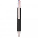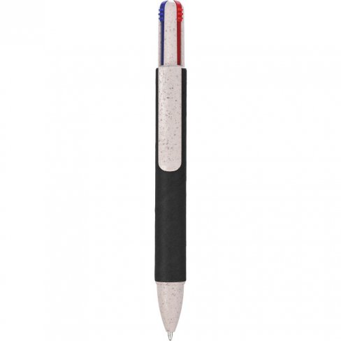 Czterokolorowy długopis, kolory wkładów: niebieski, czarny, czerwony i zielony, długość pisania 300 metrów na każdy kolor, klip ułatwiający zawieszanie na kieszeni albo okładce notatnika, produkt wykonany z kartonu pochodzącego z recyklingu i słomy pszenicznej