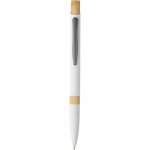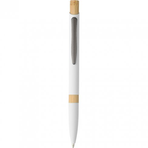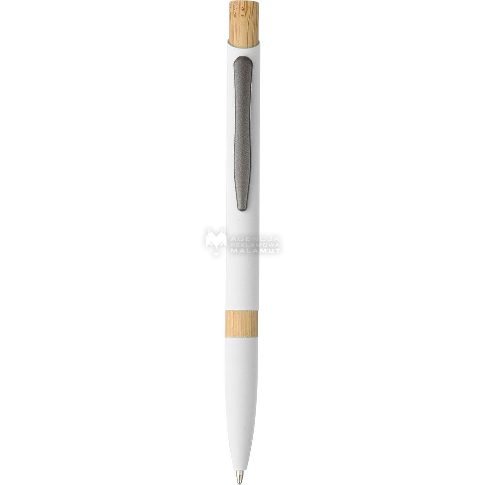 Długopis z aluminium z recyklingu, z gumowaną powłoką, bambusowym przyciskiem i bambusowym pierścieniem w korpusie, wyposażony w mechanizm przyciskowy, wkład o grubości 1,0 mm oraz niebieski tusz o szacunkowej długości pisania 800 metrów, ikona aluminium z recyklingu na produkcie
