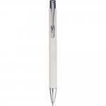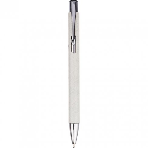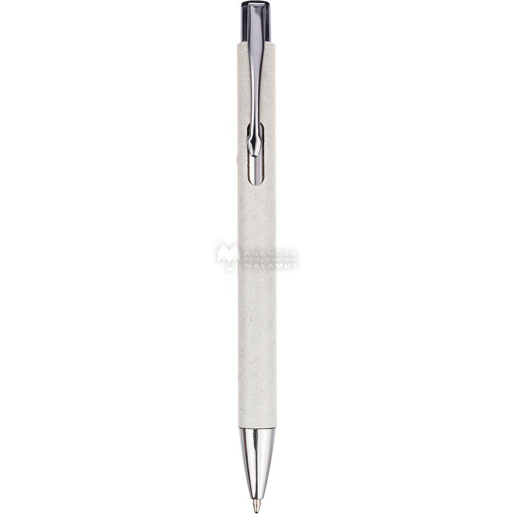 Długopis, klip ułatwiający zawieszanie na kieszeni albo okładce notatnika, wkład w czarnym kolorze, trzon wykonany z papieru z recyklingu, klips z metalu, końcówka z plastiku