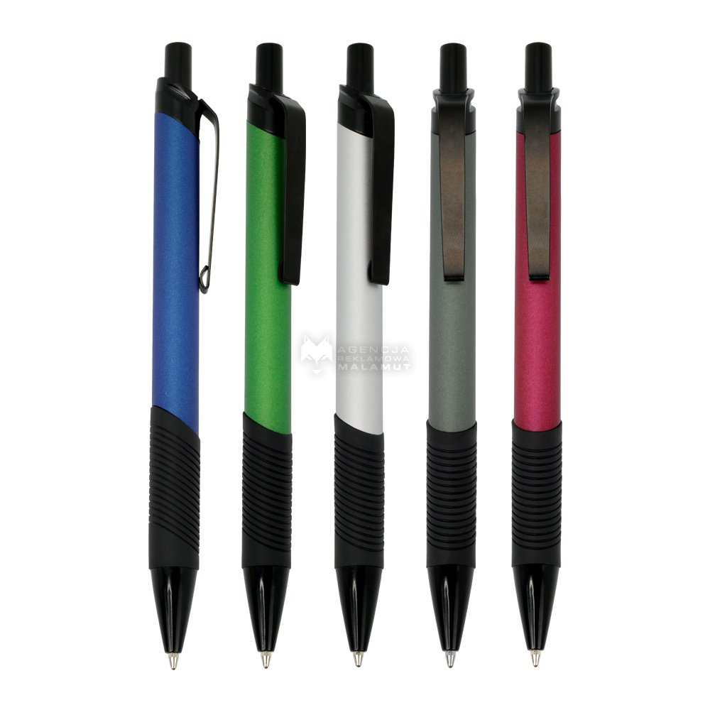 Aluminiowy długopis z czarnym klipsem i antypoślizgową gumką na korpusie. Długopis posiada wkład typu `Parker` piszący na czarno.