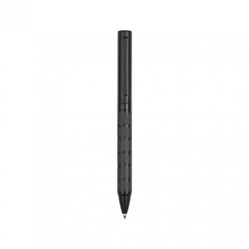 Metalowy długopis w kolorze czarnym z ciekawym wzorem na korpusie. Długopis posiada mechanizm obrotowy i niebieski wkład z końcówką o średnicy 1 mm. Długopis jest dostarczany z zapasowym czarnym wkładem w pudełku upominkowym z certyfikat autentyczności.