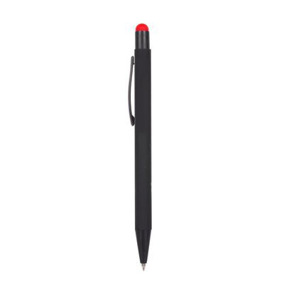 Długopis, touch pen, czarny gumowany trzon, grawer ukazuje błyszczącą powierzchnię w kolorze gumowej końcówki