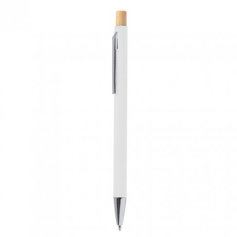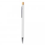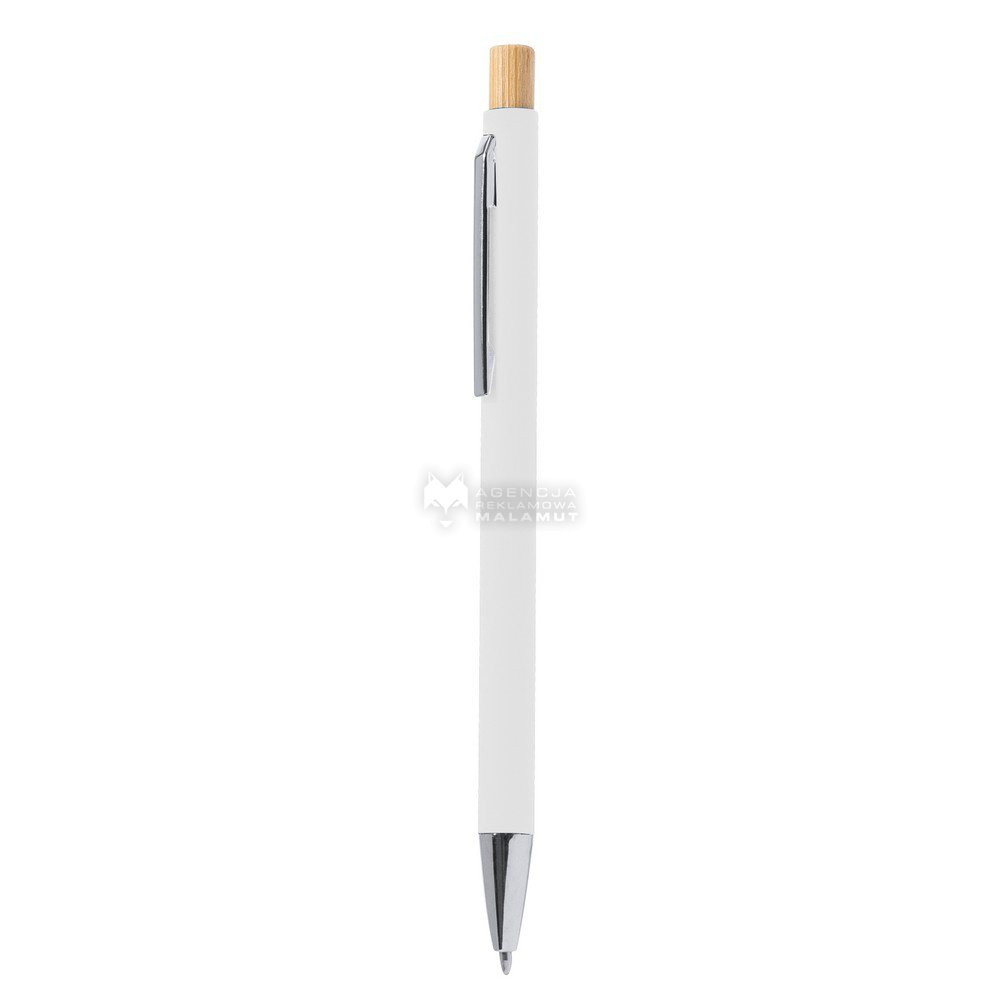 Długopis, posiada bambusowy przycisk, wkład w niebieskim kolorze, produkt wykonany z aluminium z recyklingu i bambusa, zgodny z certyfikatem GRS (Global RecycIed Standard)