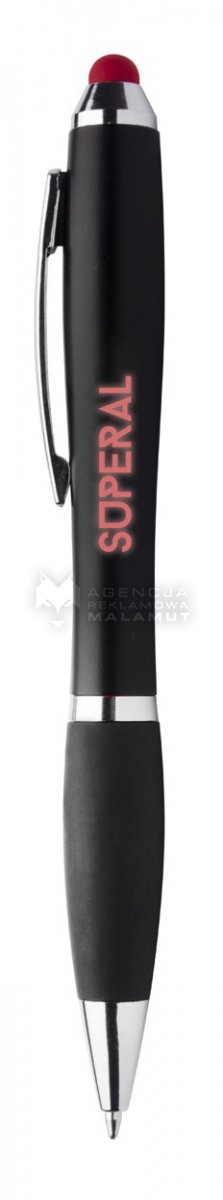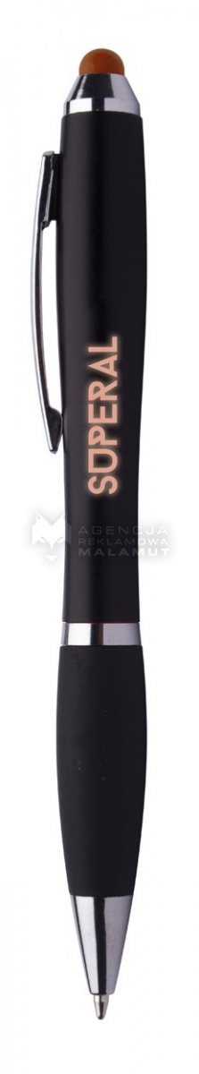 Plastikowy długopis z końcówką do ekranów dotykowych. Korpus w kolorze czarnym z gumowym uchwytem i dopasowanym kolorystycznie podświetlanym grawerem. Podświetlenie włączamy przełącznikiem na korpusie. Z baterią guzikową w zestawie. Z niebieskim wkładem.