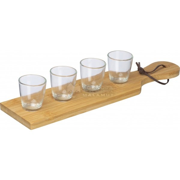 Zestaw składający się z 4 klieliszków o pojemności 30 ml oraz praktycznej deseczki z pętelką ułatwiającą transport.