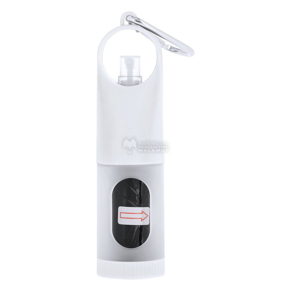 Zasobnik z 15 woreczkami na psie odchody, posiada karabińczyk umożliwiający przypinanie oraz żel do rąk 30 ml, roztwór o 62-65% zawartości alkoholu, produkt wykonany z PP
