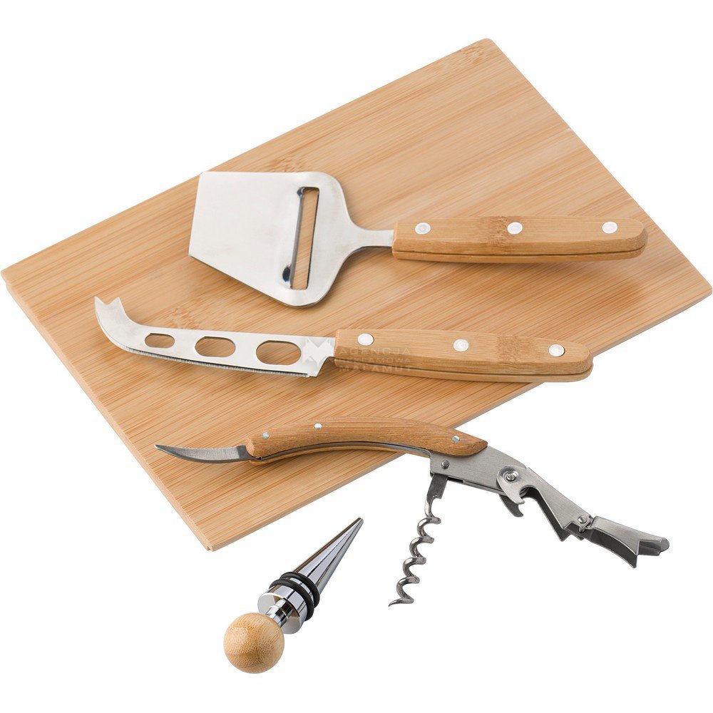 Bambusowy zestaw do sera i wina, korkociąg, zatyczka do butelki, łopatka i nóż do sera, bambusowe pudełko