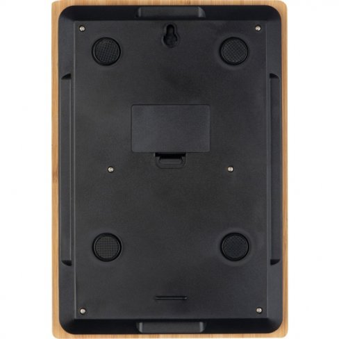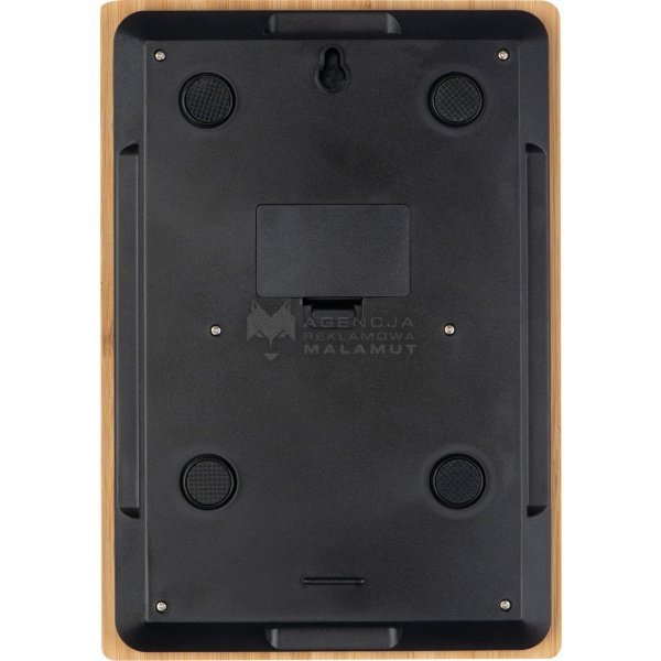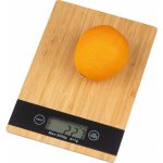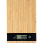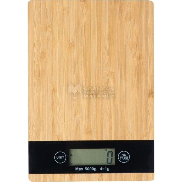 Bambusowa, cyfrowa waga kuchenna z czarnym wyświetlaczem. Maksymalne obciążenie to 5 kg, wyniki mogą być wyświetlane w kg /g /oz/ml z dokładnością do 1 g.
