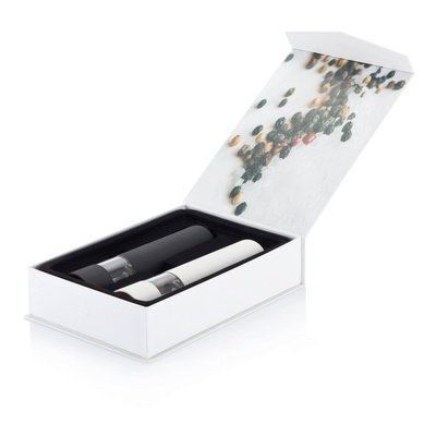 Młynek elektryczny do soli i pieprzu, wykonany z ABS, gumowe wykończenie, ceramiczny mechanizm mielący, z oświetleniem, w ozdobnym pudełku, ślad węglowy produktu: 5,4 kg CO2