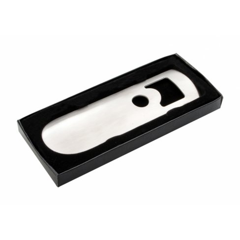 Metalowy otwieracz do butelek w czarnym pudełku.