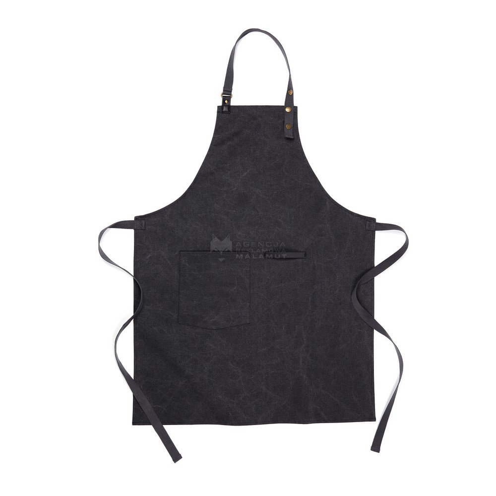 Fartuch kuchenny, wykonany z mieszanki 60% bawełny i 40% poliestru pochodzących z recyklingu, detale ze skóry wegańskiej, kieszeń z przodu, regulowany pasek