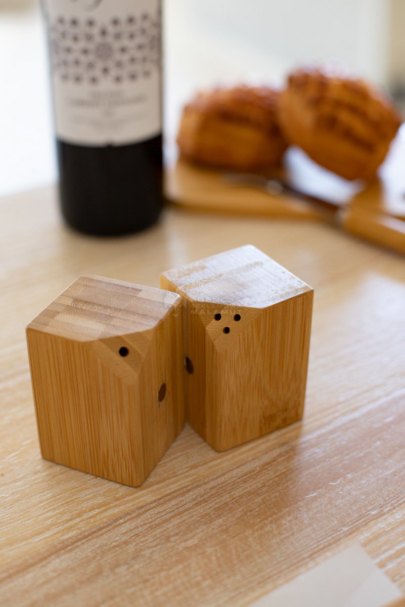 Bambusowy zestaw składający się z solniczki i pieprzniczki. Zestaw zawiera wbudowane magnesy w celu łatwiejszego przechowywania.