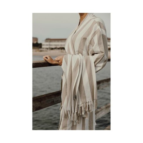 Szlafrok, wykonany z mieszanki 69% bawełny z recyklingu oraz 29% poliestru z recyklingu, miękki i przewiewny, posiada pasek w talii i kieszenie