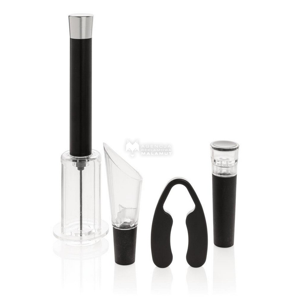 Zestaw akcesoriów do wina 4 el.: ciśnieniowy korkociąg, nóż do folii, korek z pompką próżniową, nalewak z aeratorem, w eleganckiej tubie upominkowej, ślad węglowy produktu: 0,98 kg CO2