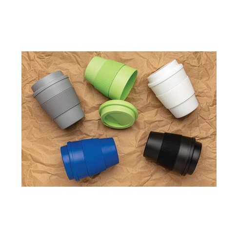 Kubek podróżny 350 ml, lekki, trwały i wielokrotnego użytku, wykonany z nadającego się w 100% do recyklingu materiału PP, silikonowy uchwyt, zakręcane wieczko, odporny na temperaturę do 100 stopni Celsjusza, kubek można myć w zmywarce i używać w kuchence mikrofalowej, ślad węglowy produktu: 0,34 kg CO2