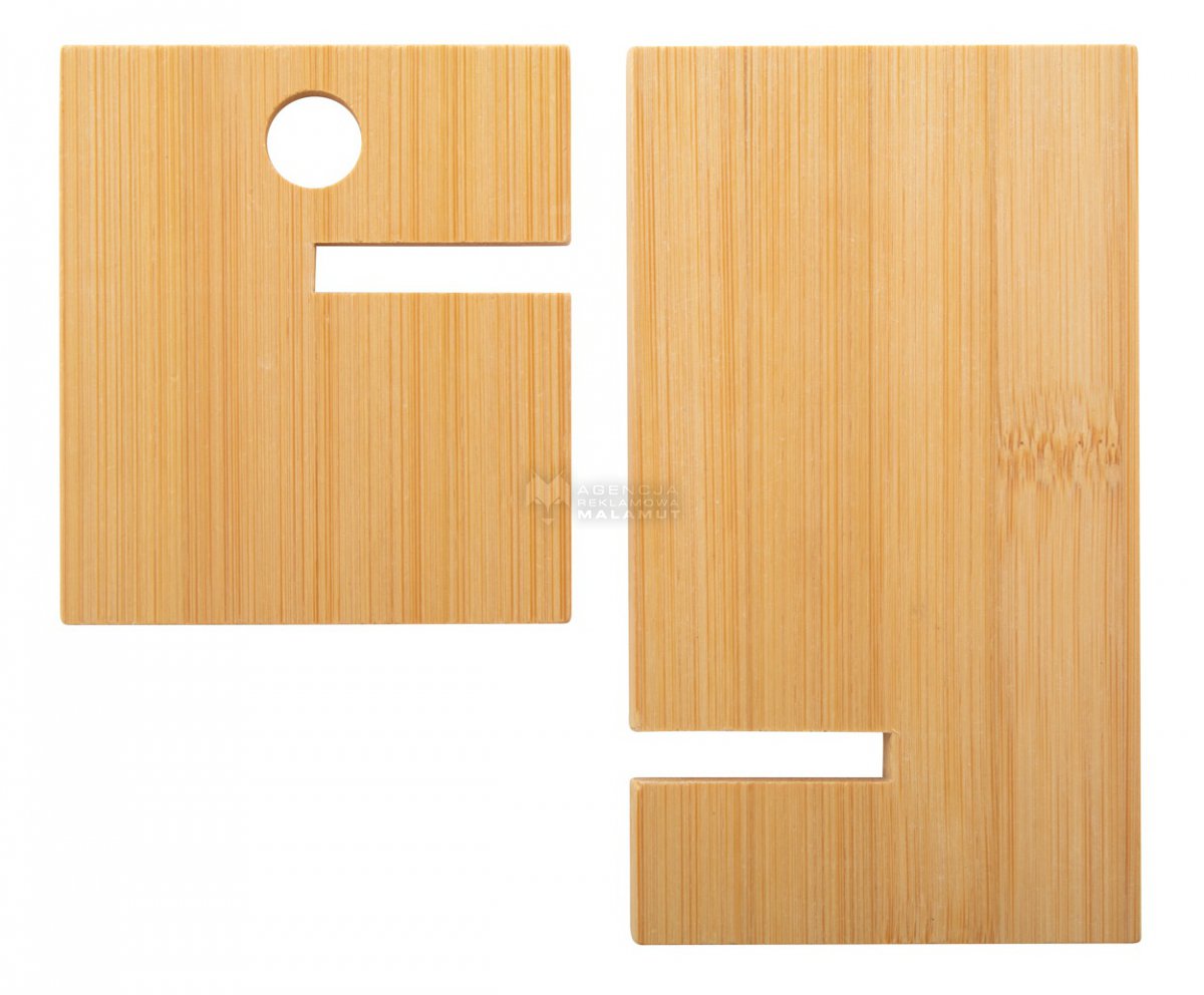 Bambusowy uchwyt na telefon komórkowy. Z otworem na kabel do wygodnego ładowania. Dostarczany na płasko.