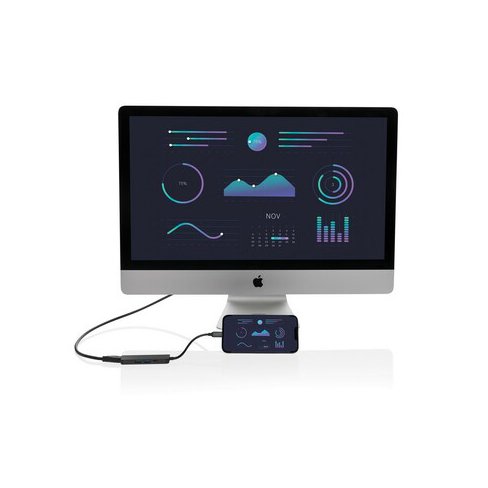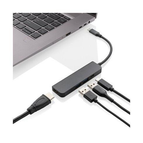 Hub USB 3.0, USB typu C Terra, wejście HDMI 4K, wykonany z aluminium z recyklingu z certyfikatem RCS, całkowita zawartość materiałów obliczona na podstawie wagi całkowitej przedmiotu: 58%, w pudełku z certyfikatem FSC® mix, ślad węglowy produktu: 0,78 kg CO2
