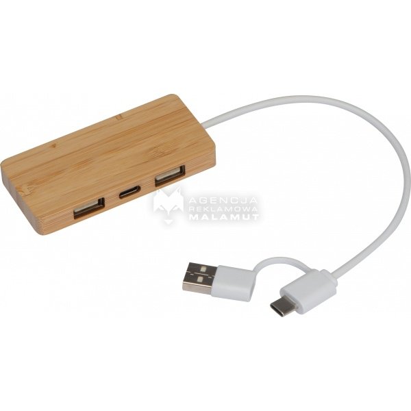 Rozgałęźnik HUB wykonany z bambusa, posiada wejście USB i USB-C oraz kabel USB z przejściówką USB-C.