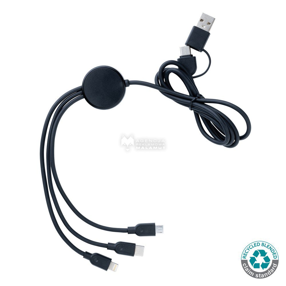 Kabel do ładowania, końcówki: USB, 2 x USB C, micro USB, iOS, obudowa wykonana z ABS z recyklingu z certyfikatem RCS (Recycled Claim Standard) który gwarantuje, że wykorzystane materiały pochodzą z recyklingu, kabel z TPE z recyklingu, długość 120 cm, w pudełku z certyfikatem FSC® mix, nie zawiera PVC, ślad węglowy produktu: 0,21 kg CO2
