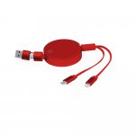 Kabel do ładowania i synchronizacji wykonany z aluminium z recyklingu z 3 końcówkami: USB typu C, micro USB oraz końcówką kompatybilną z urządzeniami iOS, zwijany