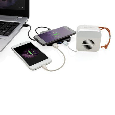 Ładowarka bezprzewodowa 5W, wykonana z ABS, dwa wyjścia USB do ładowania telefonów starszej generacji za pomocą kabla, bezprzewodowe ładowanie jest kompatybilne ze wszystkimi urządzeniami posiadającymi możliwość ładowania indukcyjnego, wejście 1A, wyjście USB 5V/1A, wyjście bezprzewodowe 5W, ślad węglowy produktu: 1,06 kg CO2