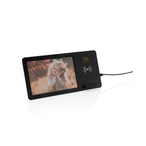 Ładowarka bezprzewodowa 5W, stojak na telefon, ramka do zdjęć o wymiarach 10 x 15 cm, bezprzewodowe ładowanie jest kompatybilne ze wszystkimi urządzeniami posiadającymi możliwość ładowania indukcyjnego, wejście 5V/2A, wyjście 5/1A 5W, 150 cm kabel micro USB z TPE bez dodatku PVC w komplecie, ślad węglowy produktu: 1,78 kg CO2
