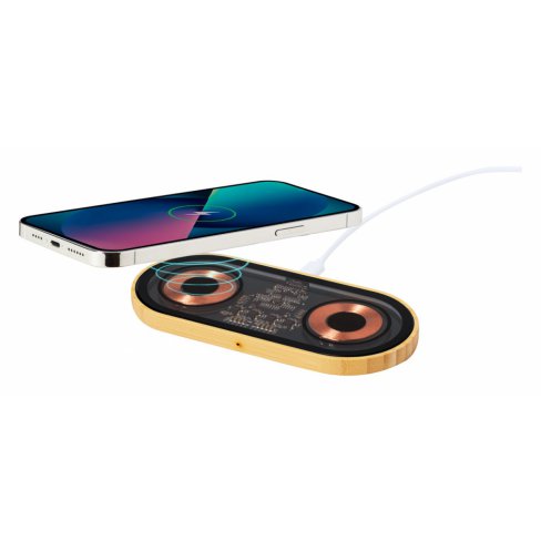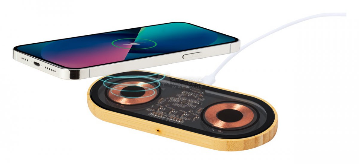 Szybka ładowarka indukcyjna z podwójną cewką (15 W) w bambusowej i przezroczystej obudowie z tworzywa sztucznego z widocznymi elementami elektronicznymi. W zestawie kabel do ładowarki USB.