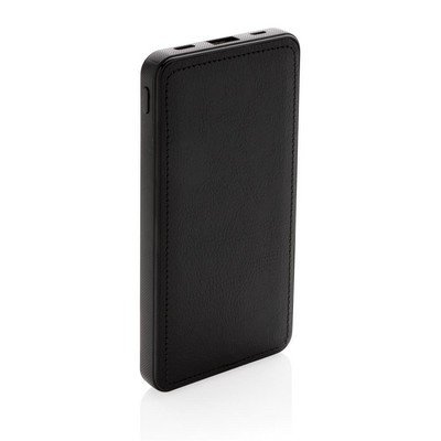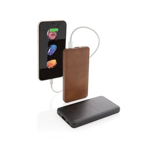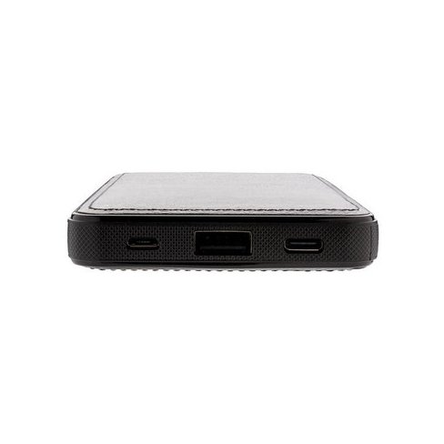Power bank 10000 mAh, efektowne wykończenie z PU, szyte detale, wbudowany akumulator klasy A umożliwia naładowanie telefonu do 4 razy, wejście USB typu C 5V/2A, wejście micro USB 5V/2A, wyjście USB typu C 5V/3A, wyjście USB 5V/2.4A, kabel micro USB z TPE bez dodatku PVC w komplecie, ślad węglowy produktu: 4,82 kg CO2