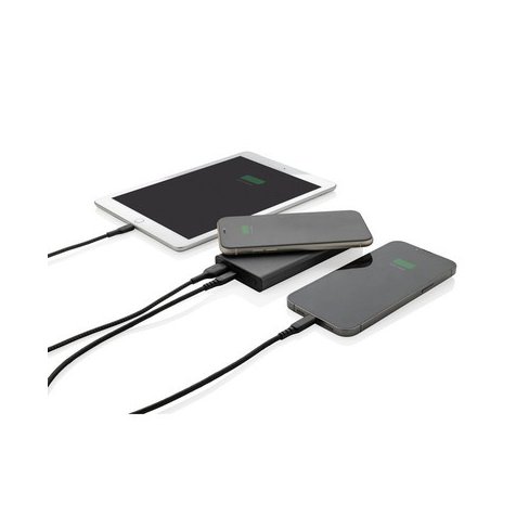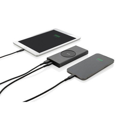 Bezprzewodowy power bank 10000 mAh, wykonany z aluminium i ABS z recyklingu z certyfikatem RCS, całkowita zawartość materiałów z recyklingu obliczona na podstawie wagi całkowitej przedmiotu: 28%, ładowarka bezprzewodowa 10W, funkcja szybkiego ładowania, 3 wyjścia do ładowania za pomocą kabla w tym USB i wyjście szybkiego ładowania PD USB typu C do ładowania również większych urządzeń (do 18W), diody wskazujące poziom naładowania, wbudowany akumulator litowo-polimerowy klasy A o dużej gęstości i trwałości, wyjście typu C umożliwia szybkie ładowanie 10W oraz ponowne naładowanie urządzenia w 3 godziny, bezprzewodowe ładowanie jest kompatybilne ze wszystkimi urządzeniami posiadającymi możliwość ładowania indukcyjnego, wejście micro USB 5V/2A, wejście micro USB szybkiego ładowania 9V/2A, 12V/1.5A, wejście typu C 5V/2A, wejście USB typu C szybkiego ładowania 9V/2A, 12V/1.5A, wyjście USB typu C 5V/3A, 9V/2A, 12V/1.5A 18W max, wyjście USB 5V/3A, 9V/2A, 12V/1.5A 18W max, kabel USB typu C bez dodatku PVC w komplecie, ślad węglowy produktu: 4,19 kg CO2