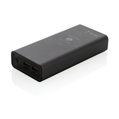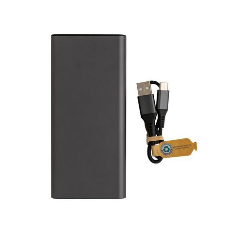 Power bank 20000 mAh, szybkie ładowanie 18W, 4 wskaźniki poziomu naładowania, wykonany z aluminium i ABS z recyklingu c certyfikatem RCS, zawartość materiałów z recyklingu obliczona na podstawie wagi przedmiotu 21%, 2 wyjścia USB, wyjście USB 5/3A, 9V/2A, 12 V/1.5A, wyjście USB typu C 5V/3A, 9V/2A, 12V/1,5A, wejście typu C 5 V/3A, 9 V/2A, 12 V/1,5A, wejście micro USB 5V/2A, 9V/2A, 12V/1,5A, ślad węglowy produktu: 7,18 kg CO2