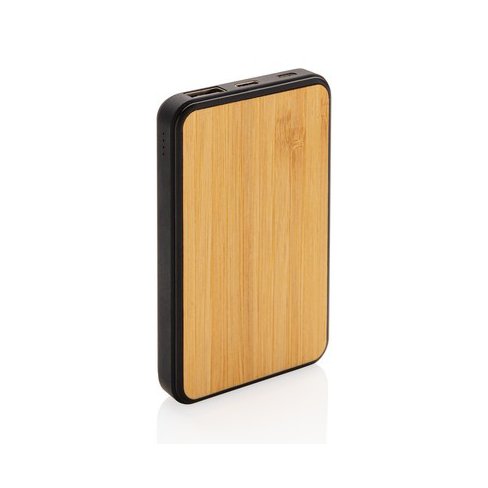 Power bank 5000 mAh, wykonany z ABS z recyklingu z certyfikatem RCS i bambusa z certyfikatem FSC®, całkowita zawartość materiałów z recyklingu: 20%, obliczona na podstawie masy całkowitej przedmiotu, wbudowany akumulator litowo polimerowy o wysokiej gęstości, wejście USB typu C 5V/2A, wejście micro USB 5V/2A, wyjście 5V/2A, w komplecie kabel z TPE z recyklingu z certyfikatem RCS®, ślad węglowy produktu: 1,94 kg CO2