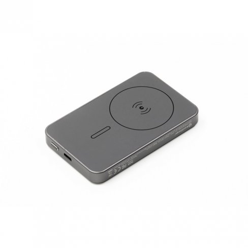 Power bank BrandCharger Powerwave 5000, smukła aluminiowa obudowa mieszcząca się w każdej kieszeni, pojemność 5000 mAh, obsługuje bezprzewodowe ładowanie magnetyczne o mocy 15 W (MagSafe, Qi1 i Qi2), co zapewnia łatwe ładowanie bez użycia kabli, port USB-C o mocy 20 W (PD 3.0) do ładowania laptopów lub innych urządzeń, wyświetlacz LCD pokazuje poziom naładowania baterii i stan ładowania, inteligentny chip zapewnia ochronę przed przetężeniem, przeładowaniem, przegrzaniem i zwarciem, zatrzask magnetyczny do szybkiego i bezpiecznego mocowania, produkt wykonany z ABS i aluminium z recyklingu