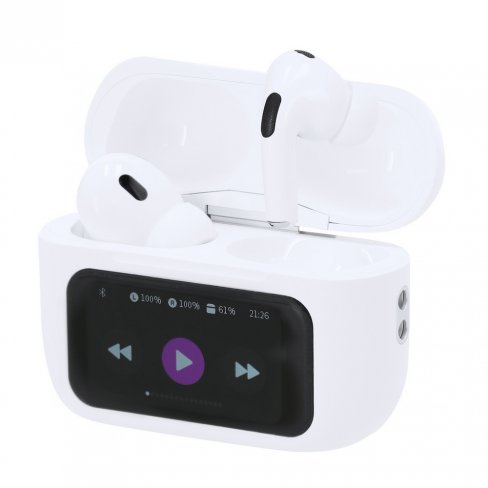 Bezprzewodowe słuchawki douszne BT 5.3 z systemem aktywnej redukcji szumów (ANC) oraz funkcją redukcji szumów otoczenia podczas rozmów (ENC), bateria słuchawek 30 mAh, posiadają etui z ekranem dotykowym i stacją ładującą słuchawki 300 mAh, czas pracy: ok. 3-4h, kabel USB-C w komplecie, produkt wykonany z ABS