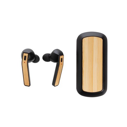Bezprzewodowe słuchawki douszne stereo, BT 5.0, wbudowany mikrofon, funkcja odbierania połączeń, wykonane z naturalnego bambusa i ABS, w komplecie etui z akumulatorem 500 mAh pełni funkcję stacji ładującej, akumulator słuchawek o pojemności 35 mAh umożliwia odtwarzanie muzyki na średnim poziomie głośności do 3 godzin, ponowne naładowanie za pomocą etui w 1 godzinę, zasięg do 10 m, 3 rozmiary nakładek dousznych w komplecie, ślad węglowy produktu: 0,79 kg CO2