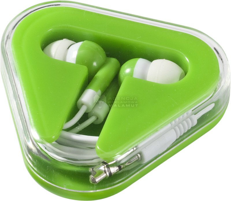 Plastikowe trójkątne etui z miejscem na schowanie kabla. Słuchawki kompatybilne z każdym standardowym urządzeniem z audio jack 3,5 mm. Plastik ABS.