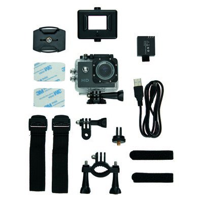 Kamera sportowa HD, rozdzielczość 720p, wyświetlacz TFT LCD 1.5", możliwość rozszerzenia pamięci za pomocą karty micro SD do 32 GB (nie jest dołączona), czas nagrywania do 70 minut, wodoodporny pokrowiec i 11 akcesoriów w komplecie