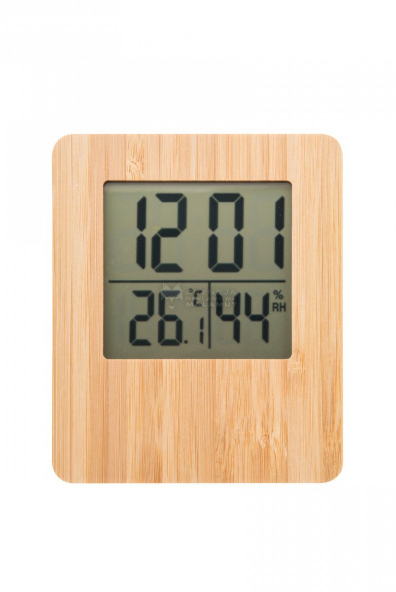 Stacja pogodowa i zegar cyfrowy z bambusowym panelem przednim. Funkcje: budzik, kalendarz, termometr i wyświetlacz wilgotności. Działa z 2 bateriami AAA, bez baterii.