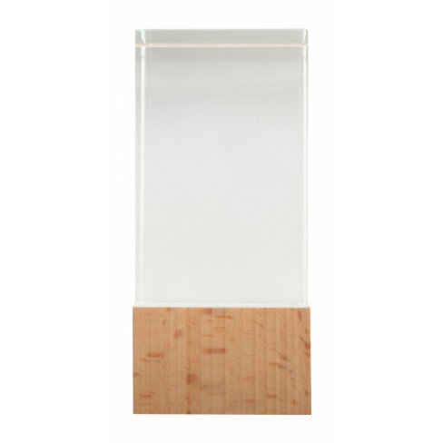 Szklane trofeum z podstawą z drewna bukowego. W pudełku prezentowym z papieru kraft.