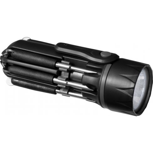 Idealne urządzenie w domu, posiada 1 diodę LED, 3 głowice Phillips, 3 płaskie głowice i małe szklane oko ze śrubą. Naciśnij przycisk raz, by włączyć latarkę i ponownie, by dioda LED oświetliła narzędzie. Zapakowana w pudełko upominkowe STAC. Baterie w zestawie. Ekskluzywne wzornictwo. Plastik ABS.