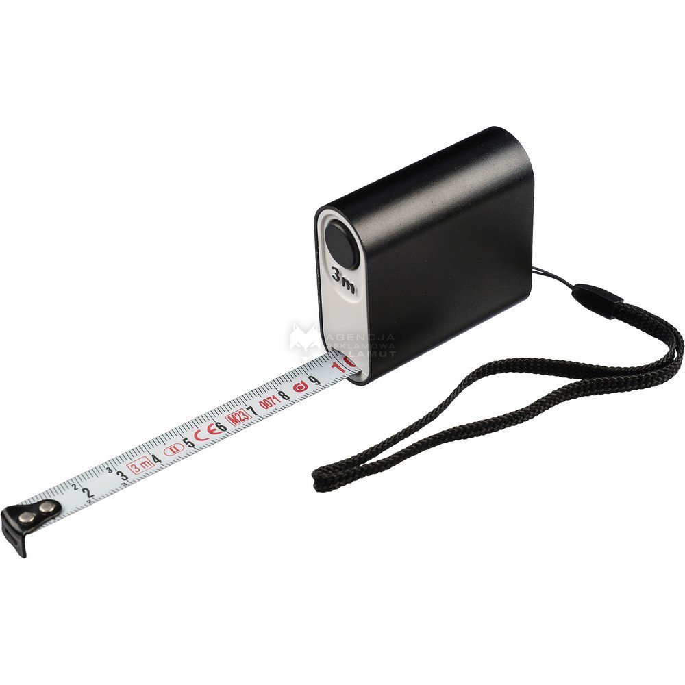 Miara 3m w centymetrach, opaska na nadgarstek ułatwiająca noszenie, zapakowana w brązowy kartonik, produkty wykonany z ABS i metalu