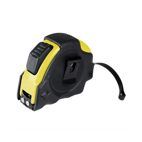 Miara 5 m z uchwytem ułatwiającym noszenie oraz dodatkowym klipem umożliwiającym przyczepienie np. do paska, na końcu znajduje się magnetyczny zaczep ułatwiający korzystanie z miary, produkt wykonany z metalu i plastiku