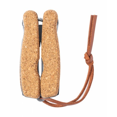 Narzędzie wielofunkcyjne (12 funkcji) ze stali nierdzewnej z naturalnego korka. Z paskiem do noszenia ze skóry PU.