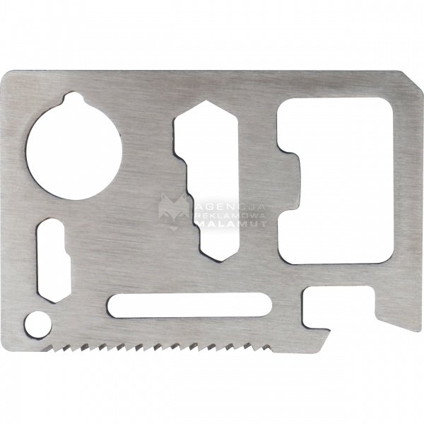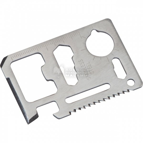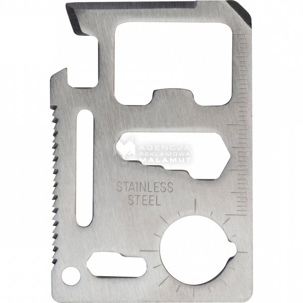 Multinarzędzie 15 w 1, wykonane ze stali nierdzewnej. Funkcje: otwieracz do puszek, nóż, śrubookręt, otwieracz do butelek, linijka, 4 klucze sześciokątne (6/7/8/10mm), kątomierz, 2 klucze sześciokątne (4/5mm), piła, klucz motylkowy.