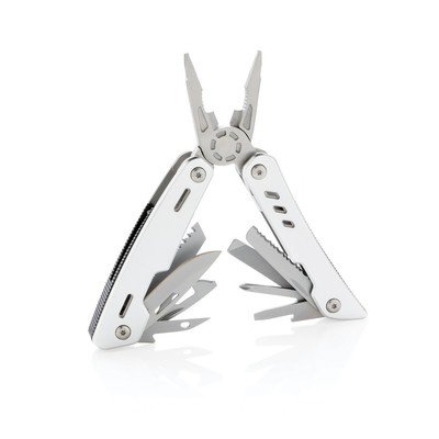 Narzędzie wielofunkcyjne, trwałe i wytrzymałe, wykonane ze stali nierdzewnej, aluminiowy uchwyt, 12 funkcji: szczypce, kombinerki, przecinak do kabli i drutu, nóż, śrubokręt krzyżakowy, mały śrubokręt płaski, piła, otwieracz do puszek, otwieracz do butelek, ostrze ząbkowane, szpikulec, pilnik i duży śrubokręt płaski, w ozdobnym pudełku, ślad węglowy produktu: 2,75 kg CO2