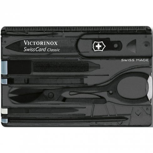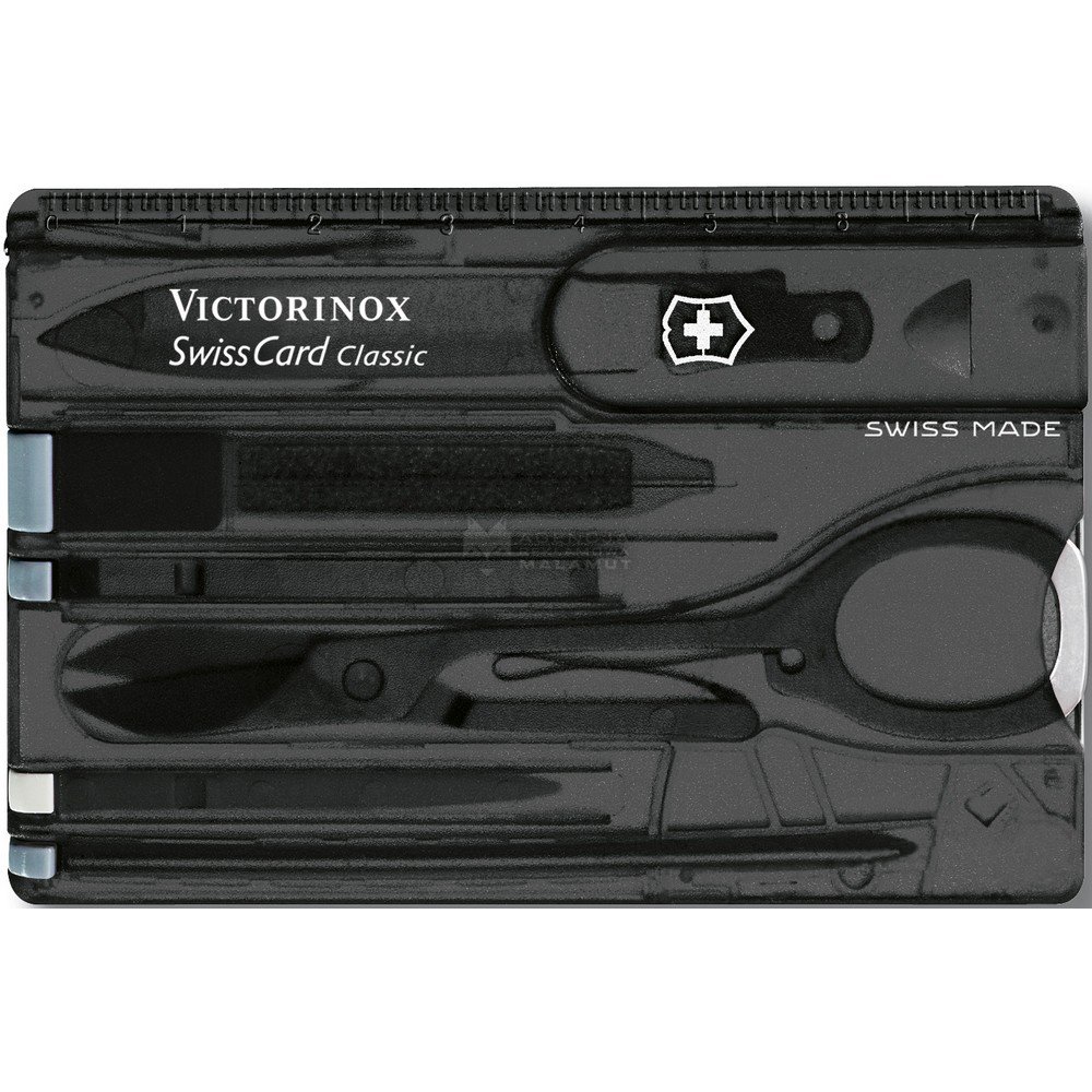 Narzędzie wielofunkcyjne Victorinox SwissCard Classic, w zestawie: nożyk do listów, pęseta, nożyczki, pilnik do paznokci, wykałaczka, długopis i stalowa szpilka, zapakowane pojedynczo w pudełko upominkowe, produkt wykonany ze stali nierdzewnej i plastiku