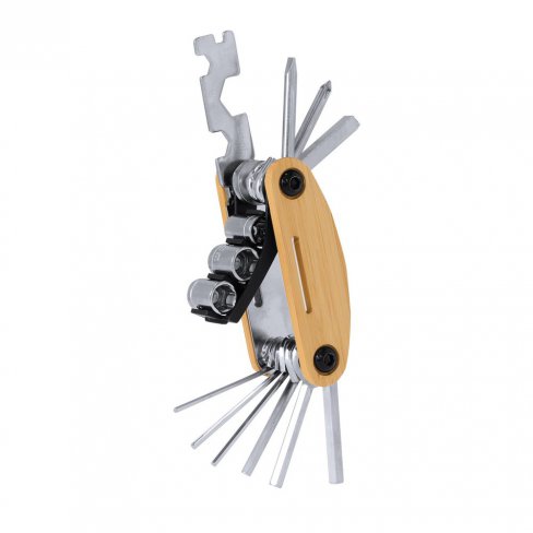 Narzędzie wielofunkcyjne, zestaw narzędzi rowerowych, 15 funkcji, 6 kluczy imbusowych, płaski śrubokręt, śrubokręt krzyżakowy, klucz płaski, 3 nasadki sześciokątne i adapter, produkt wykonany z bambusa i stali węglowej