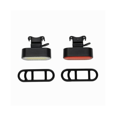 Zestaw 2 lampek rowerowych 1W, jasność 60 lumenów, wodoodporne IPX4, 5 trybów świecenia, wbudowana bateria o pojemności 400 mAh umożliwia ciągłą pracę do 2,5 godzin, ponowne ładowanie w ciągu 1 godziny, wykonane z ABS z recyklingu z certyfikatem RCS, kabel USB typu C z TPE z recyklingu w komplecie, całkowita zawartość materiałów z recyklingu obliczona w oparciu o wagę całkowitą przedmiotu: 43%